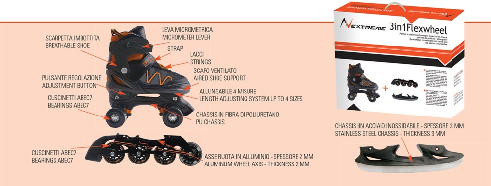 Pattini a rotelle trasformabili in pattini in linea e pattini da ghiaccio.